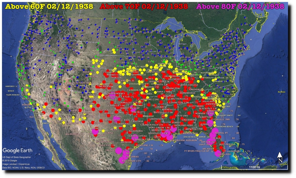 On February 12, 1938, Texas was 86°F, Florida was 83°F, Georgia was 81°F, Louisiana Mississippi and Oklahoma were 80°F, Alabama and Arizona were 79°F, Arkansas, Illinois, and Indiana were 78°F, Kansas, New Mexico, and South Carolina were 77°F, Colorado and Tennessee were 76°F, Kentucky and Nebraska were 74°F, and Missouri was 73°F.