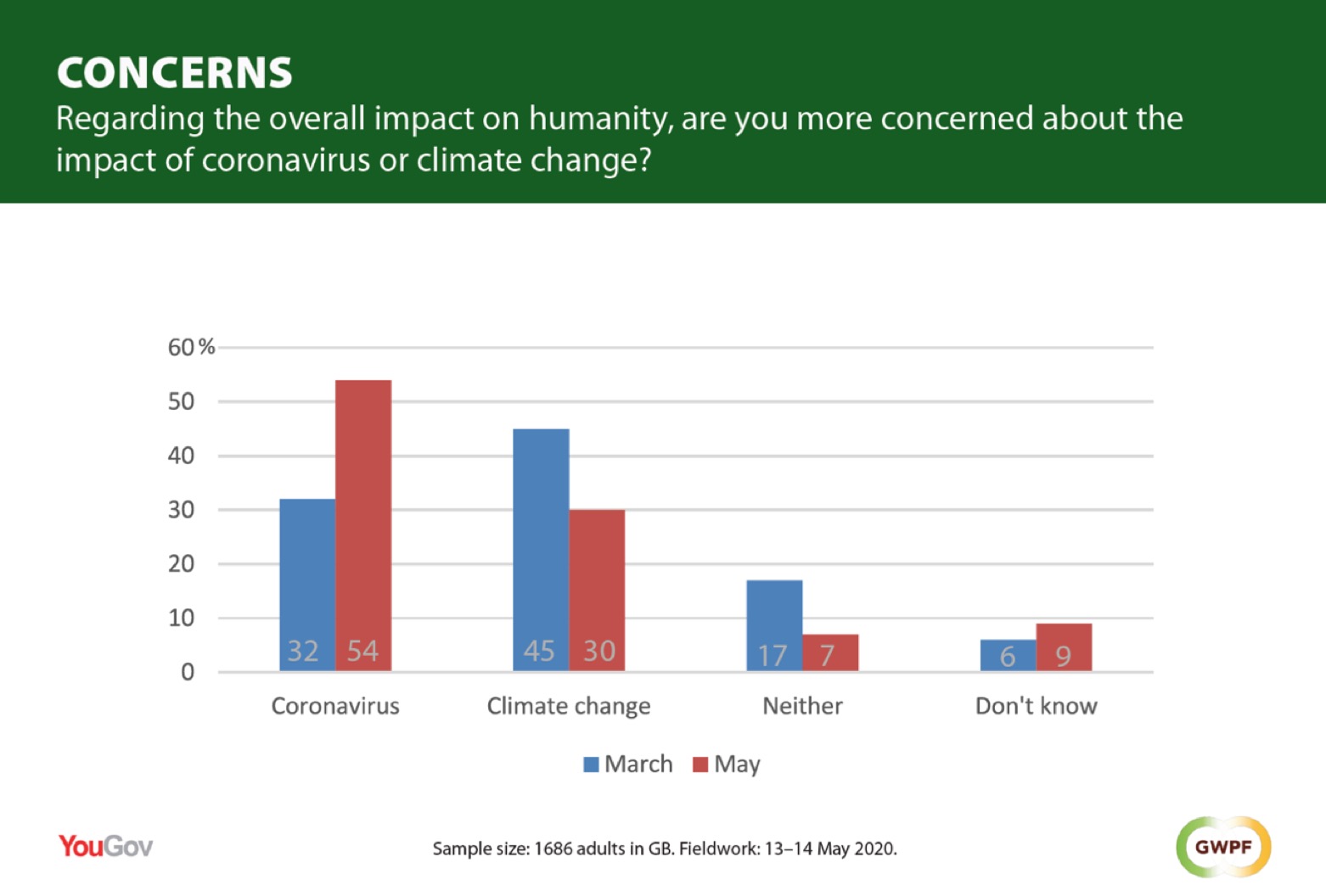 This time, 54% said ‘coronavirus’, up from 32% in March. Only 30% said ‘climate change’, down from 45%.