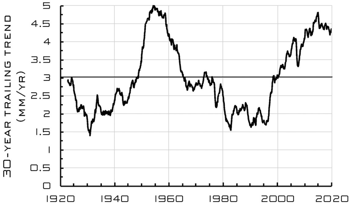 The rate went down tremendously. And then it went back up again; currently, it’s at about three millimeters a year, just a bit higher than it was in 1940.