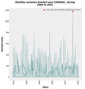 Monthly data for the city also show the sporadic nature of rainfall in the city with many high rainfall months since 1969, shown in Figure 2. This means that intense downpours are not uncommon in the city.