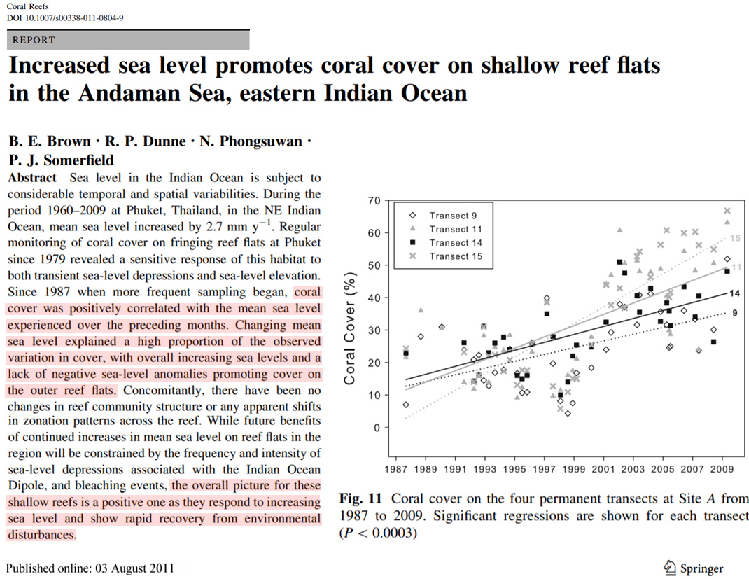 Long-term observations of coral reefs indicate rising sea levels “not only promoted coral cover” but also “limit damaging effects of thermally-induced bleaching” (Brown et al., 2019).