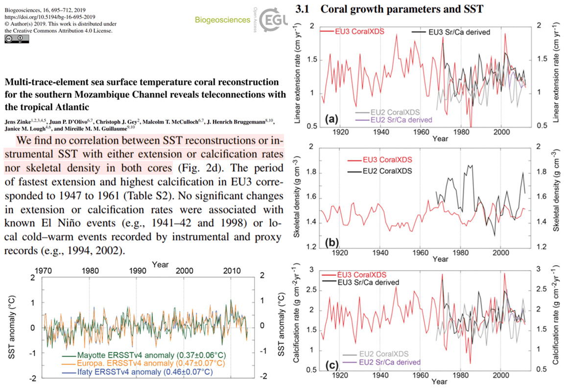 Another new study (Zinke et al., 2019) indicates there is no correlation between coral growth rates (calcification, skeletal density) and long-term (since 1910) changes in sea surface temperatures.