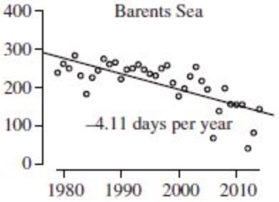Data on Barents Sea ice since 2006 has been published by Regehr et al. (2016) but only up to 2015. It shows the greatest decline of all Arctic regions: a loss of 4.11 days per year. It appears that this trend may have continued until 2022 (Frey et al. 2022).