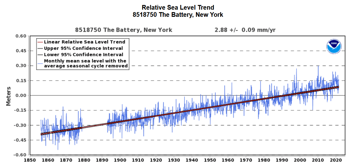 New York has tidal gauge data going back to 1856, and sea levels have been rising there at a rate of 2.88mm (0.11in) a year since the mid 19th century, long before SUVs. Again, it is plain that there is no acceleration in the rate.