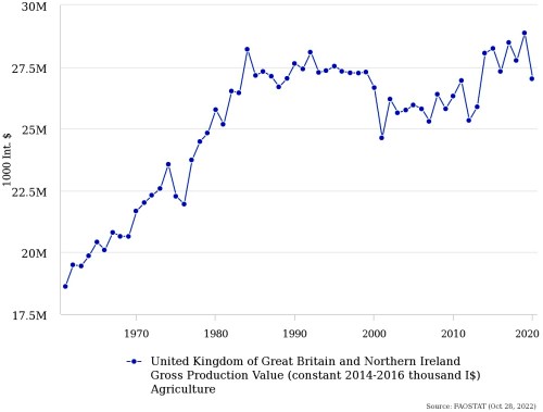 And what about this ‘food security’ Harries is waffling on about? Agricultural output has been steadily rising since the BSE scare of the 1990s: