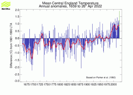 The Central England Temperature Record, below, the longest continuously-monitored temperature record in the world, shows that England has seen an increase of 1.4C since 1659.