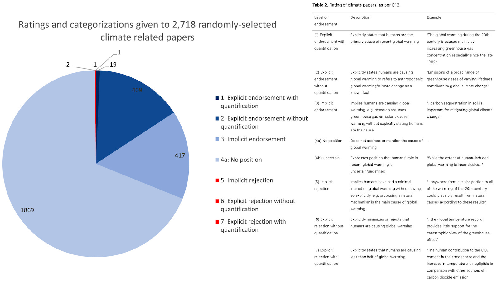 The 2021 paper found that an overwhelming number of papers sampled agreed with the human impact on global warming, but most would not even quantify the human share of warming.