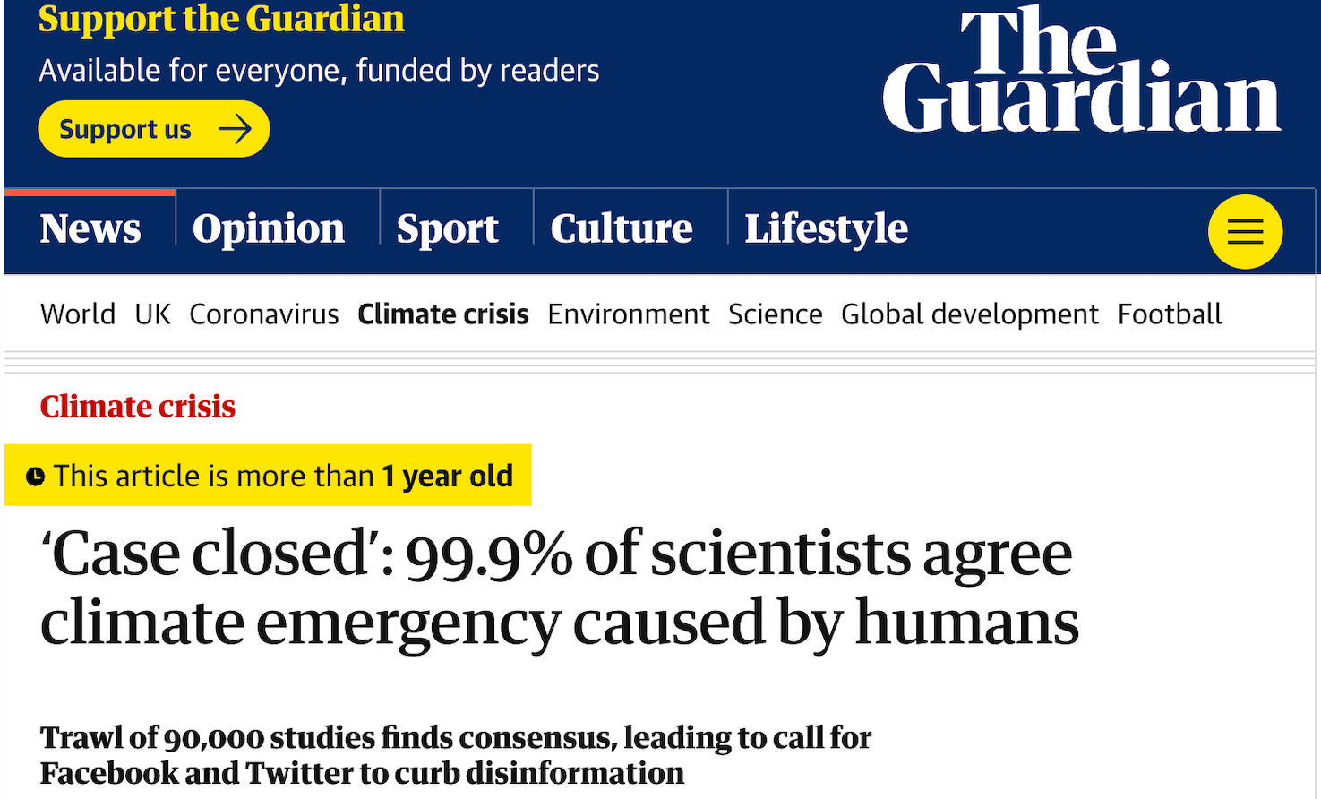 Going beyond “97%,” “99%” abuser The Guardian took a paper claiming 99% agreement on humans impacting climate to some extent to mean “99.9% of scientists agree climate emergency caused by humans.”