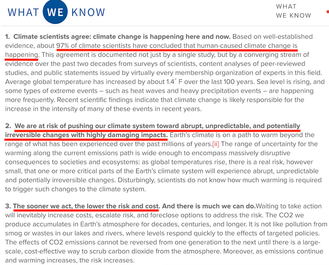 Truth: Most climate scientists agree that we have some climate impact. This does not at all justify the rapid elimination of fossil fuels. [emphasis, links added]