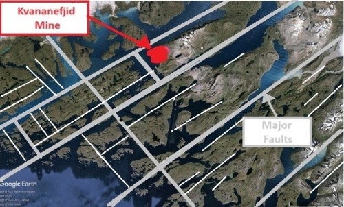 Figure 3 shows the Kvanefjeld mine as solid red, ocean water as blue, major faults as thick white lines, and minor faults as thin white lines. All the geological features provide pathways that allow fresh water, ocean water, and pollutants to intermix.