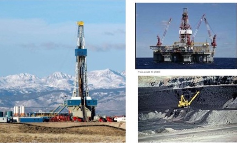 Locating open pockets of methane gas requires drilling downward from land or ocean floors. The left part of Figure 4 is a photo of a land-drilling rig. Teams of engineers, geophysicists, and land people work to find promising underground areas that could contain pockets of methane gas.