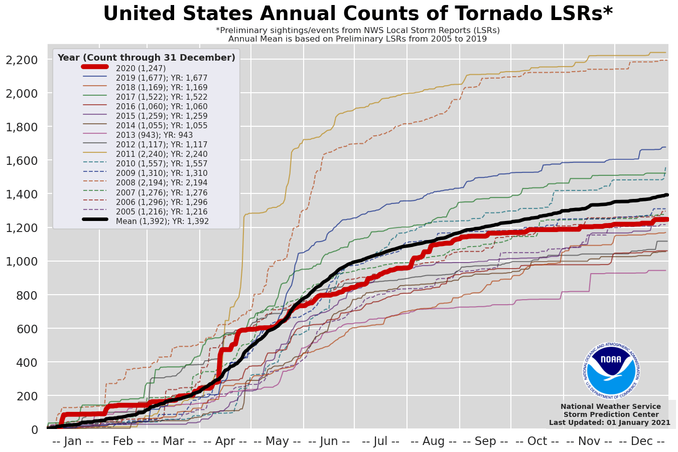 The National Weather Service Storm Prediction Center (NWS SPC) reports 1,247 U.S. tornadoes in 2020, as shown in the graph below from the NWSSPC website.