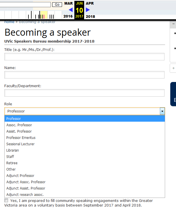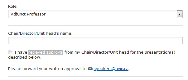 And please do note: if you’re a non-academic member of UVic’s staff (the head of the Speakers Bureau, for example), a retiree, a librarian, or an “other,” you aren’t required to jump through these ‘get permission from above’ hoops.