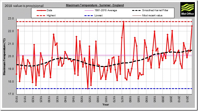 Finally, summers in England are not getting hotter. The hottest summer still remains that of 1976. Indeed, last summer was the only one other than 1976 which was actually hotter than 1911!