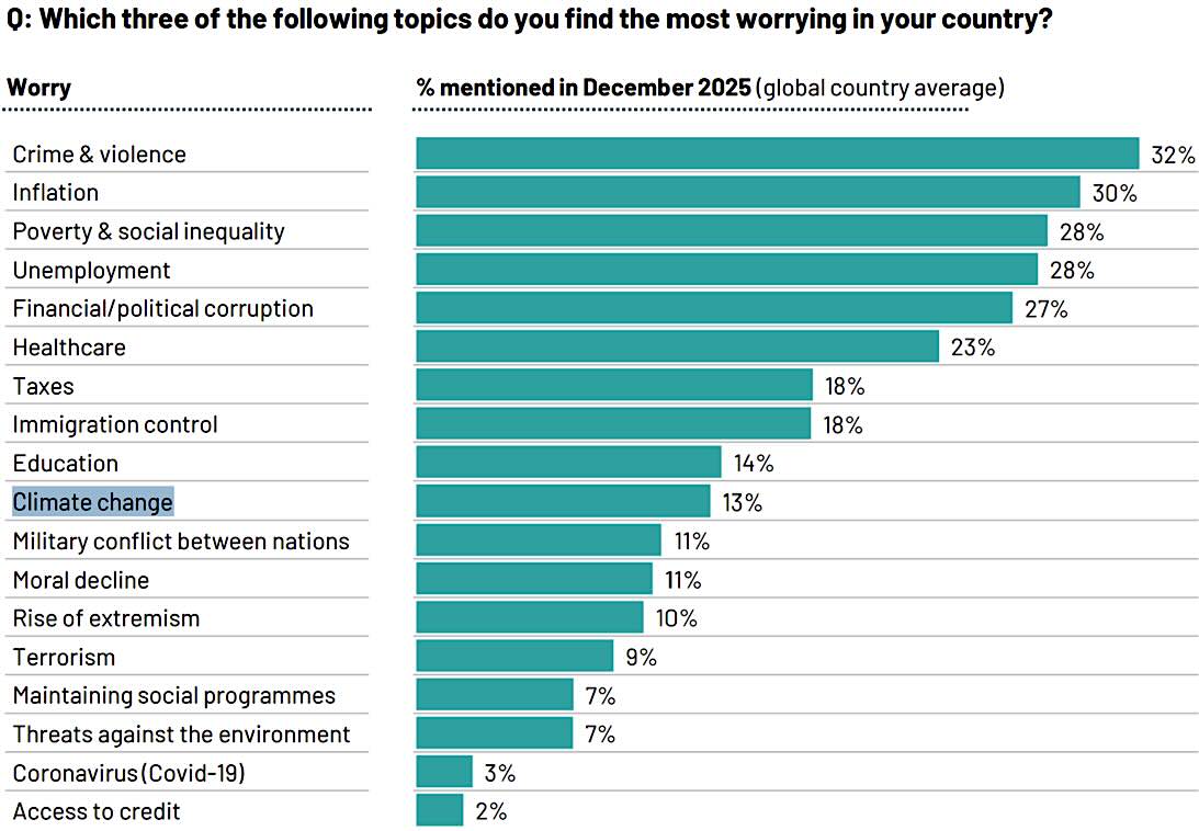 Ipsos, a market research company that the WEF itself frequently looks to, reports in its annual “What Worries the World?” survey that climate change barely makes the top ten issues most people in the world are concerned about. (see the graph, below)