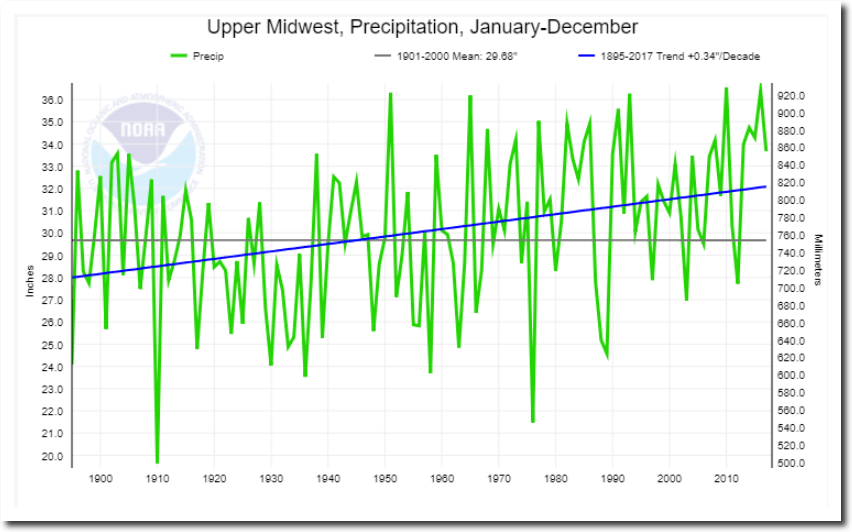 All of Hansen’s temperature forecasts were wrong, as were his drought forecasts. Both the US and the Midwest have gotten much wetter over the past century, the exact opposite of Hansen’s forecasts.