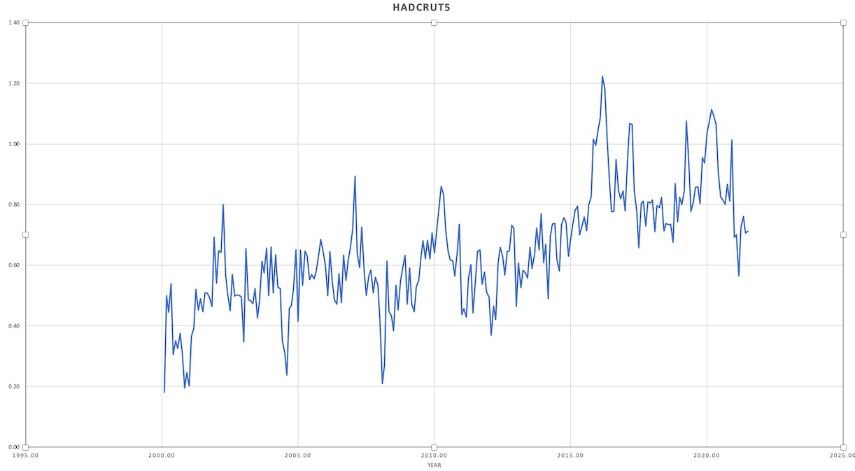 Consider the HadCRUT5 global temperature database maintained by the UK Met Office.